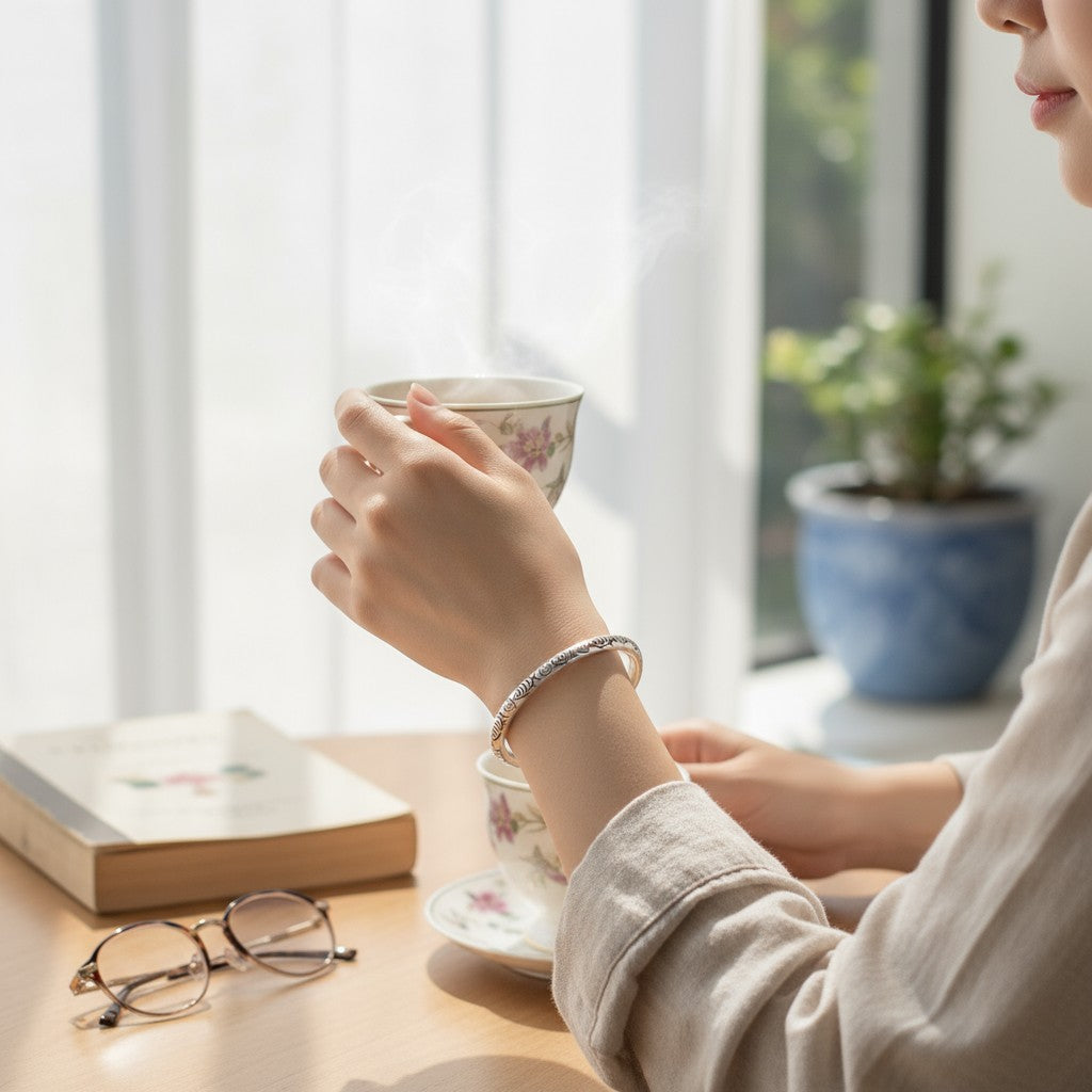 Minimal silver bangle etched with fish motifs, symbolizing prosperity and flow.