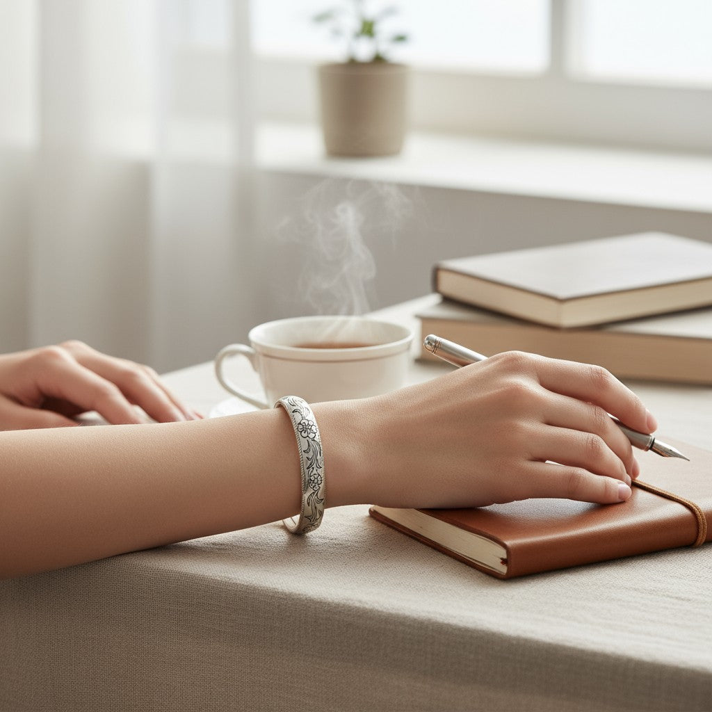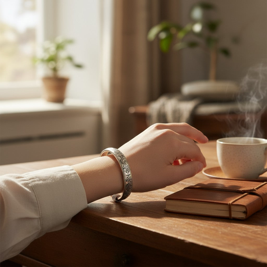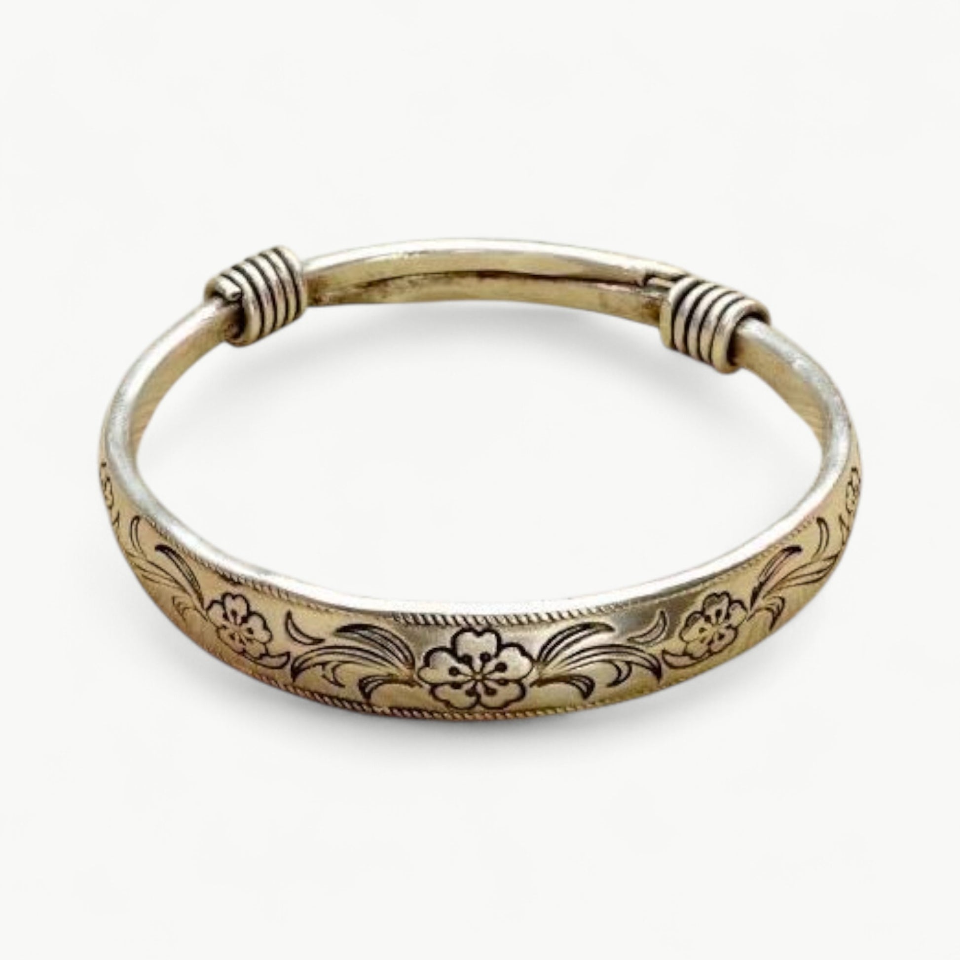 This 925 sterling silver bangle highlights traditional craftsmanship with fine floral engravings across its surface. Its lightweight design makes it perfect for layering.