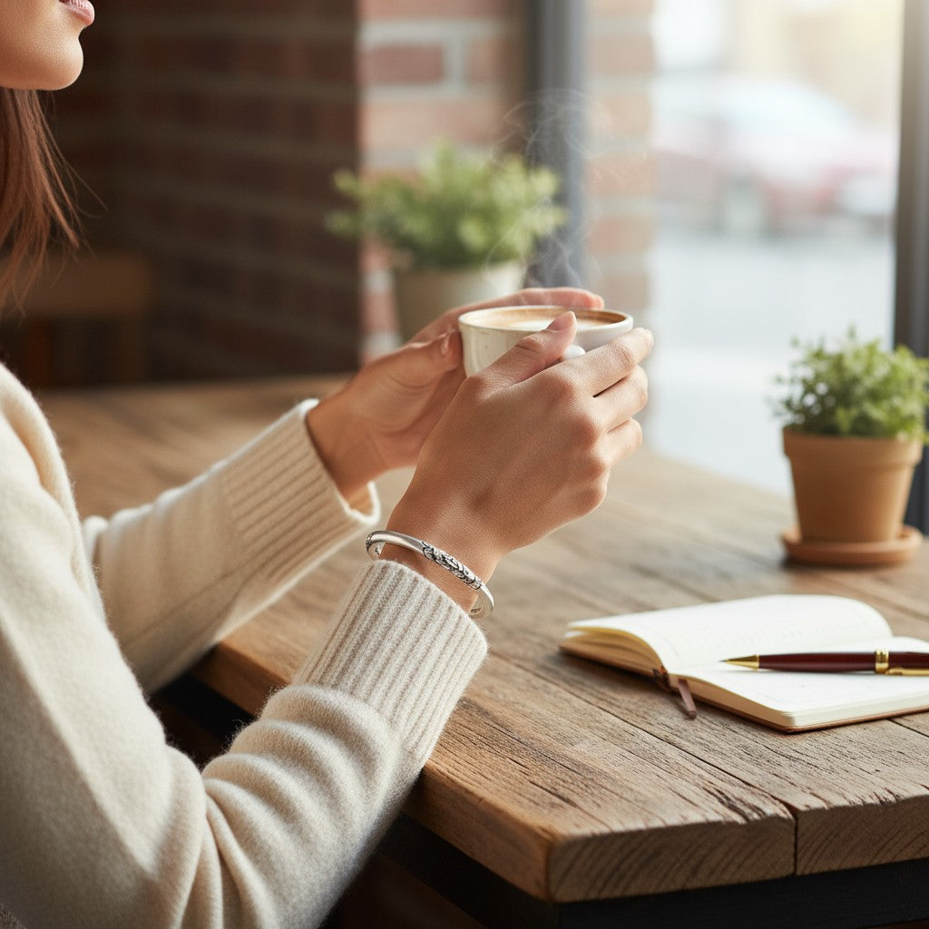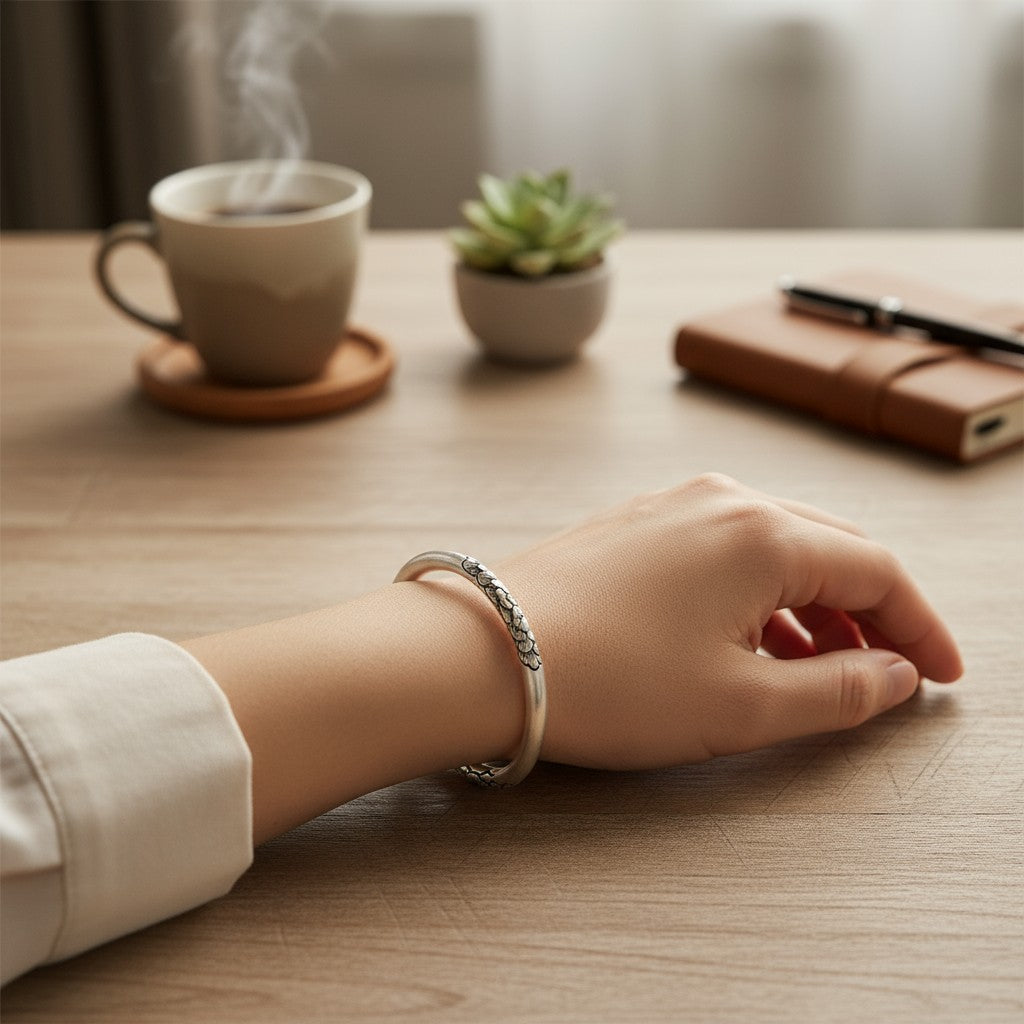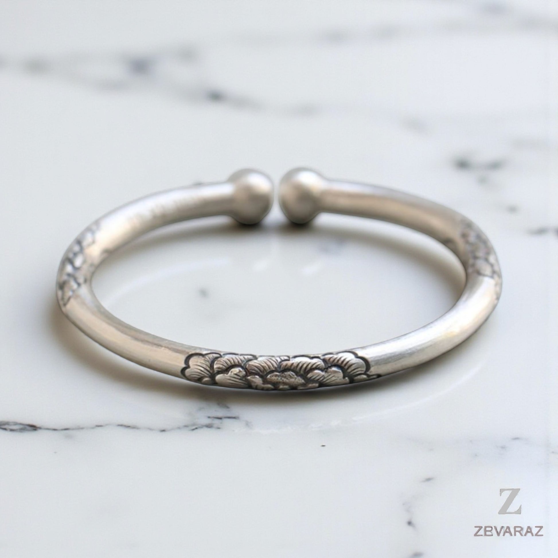 A dainty silver cuff with hand-carved peony flower details — symbol of love and honor