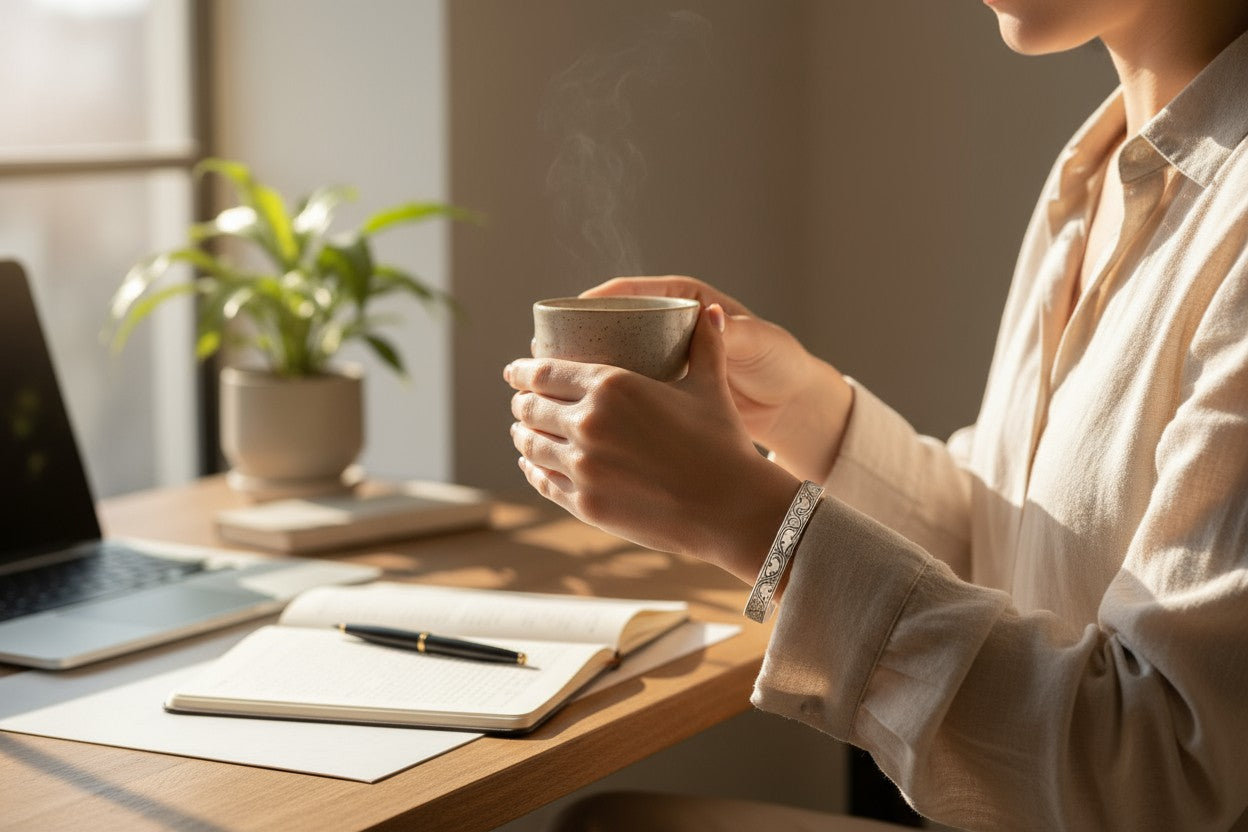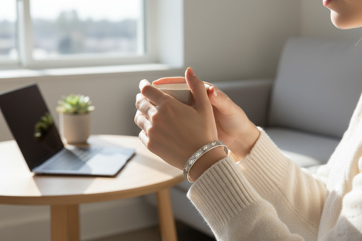 Elegant sterling silver cuff with engraved wave designs — inspired by ocean flow.